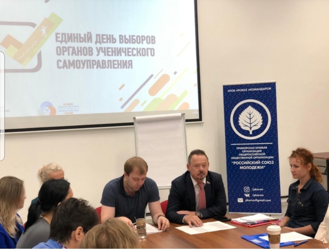 В качестве председателя попечительского совета Приморской краевой организации «Российский Союз молодежи», Депутат Госдумы Владимир Новиков принял участие в установочном совещании по организации "Единого дня выборов органов ученического самоуправления", который пройдет в Приморье в сентябре этого года. В совещании приняли участие представители органов управления образования из различных муниципалитетов Приморья, директор департамента молодежной политики Елена Томчук1. Для решения поставленных целей и задач по организации не только этого мероприятия, но и комплекса мероприятий с молодежью Приморья, совместно с Губернатором Приморского края Олегом Кожемяко подписано Соглашение – «Дорожная карта по работе с детьми и молодежью Приморского края на 2019 -2023 гг.».